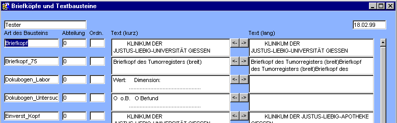Die Briefkopf-Pflege ist untrennbar verbunden mit dem Berichtswesen, denn ohne Berichte haben Briefköpfe ja keinen Sinn. In einigen Fällen befinden sich in dieser Tabelle auch Textbausteine, die mitten in Briefen stehen. Es sind folgende Felder vorhanden: