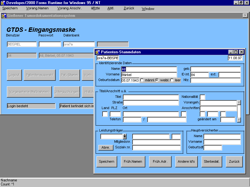 | Vorbemerkung: Diese Seite zeigt die zur Zeit realisierten Eingabemasken für die grafische Version des Gießener Tumordokumentationssystems aus der Sicht des normalen Benutzers. Die Systemverwaltungsfunktionen sind zum großen Teil bereits umgesetzt, stehen aber diesem Benutzer normalerweise nicht zur Verfügung. Die Bilder sind wegen der Größe der Bilddateien nicht direkt eingebunden. Bitte benutzen Sie die Funktion Back/Zurück Ihres Browsers, um aus den Bildern wieder in dieses Dokumenzt zu gelangen. Die Auflösung der Bilder auf dem Originalbildschirm wurde beibehalten, um eine möglichst gut erkennbare Version zu erhalten. Teilweise ist ein Benutzen der Scroll-Bars notwendig, um Bilder ganz zu sehen. GTDS und diese Bildschirmpräsentation werden kontinuierlich ausgebaut. | ![]() |